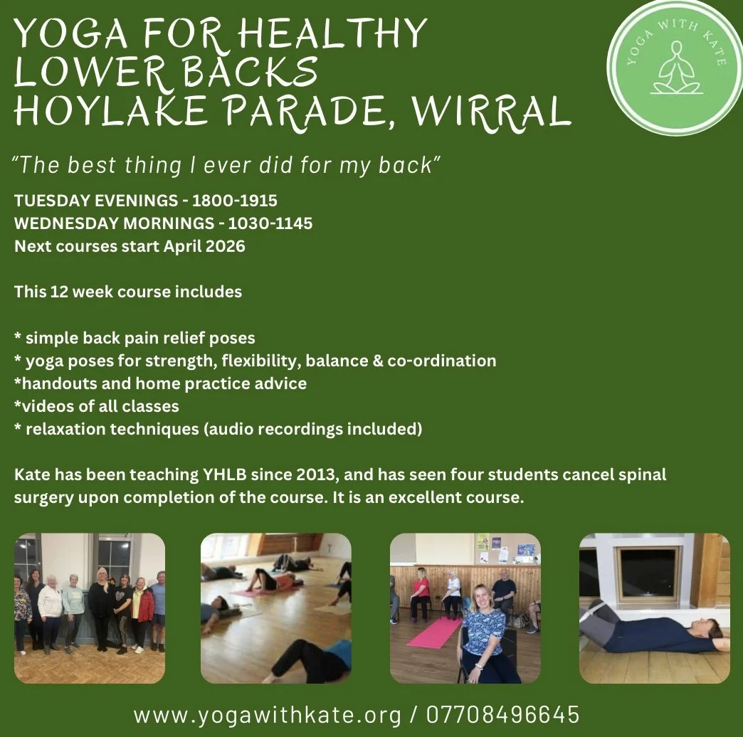 "Yoga for Healthy Lower Backs is a very good course, taught excellently by Kate. As well as back strengthening exercises I have learnt relaxation and breathing techniques. I now try to incorporate good posture and pelvic floor exercises into everyday life. As well as practising my Yoga of course!" -Caz, Greasby, Dec 2013